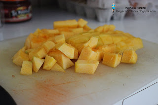 Na patelnię wlewamy niewielką ilość wody i wstawiamy na palnik. Następnie kroimy pierś w kostkę i wrzucamy na rozgrzaną patelnię. Po chwili dorzucamy drobno pokrojone warzywa. Wszystko kroiłem w kostkę poza marchewką, którą starłem na tarce. Najpierw dodałem cebulę, następnie paprykę, marchew, pieczarki, pomidory. Zaś na samym końcu kabaczka. Całość przyprawiamy i trzymamy na gazie, od czasu do czasu mieszając, aż do momentu kiedy warzywa nieco zmiękną. Następnie przekładamy do miseczki i voila - gotowe. Smacznego!